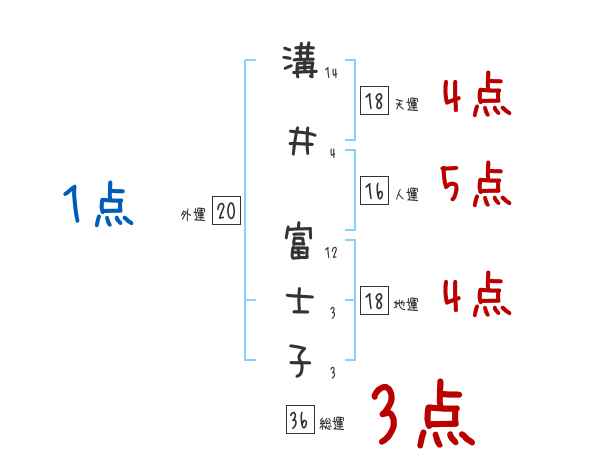 天運![]() | 溝井富士子さんの天運は18画の4つ星!情熱的で剛気。忍耐力があり信頼される。 家系が持つ宿命的な運勢を表します。祖先から受け継いだ苗字ですので自分の力が及びません。家柄を象徴します。 |