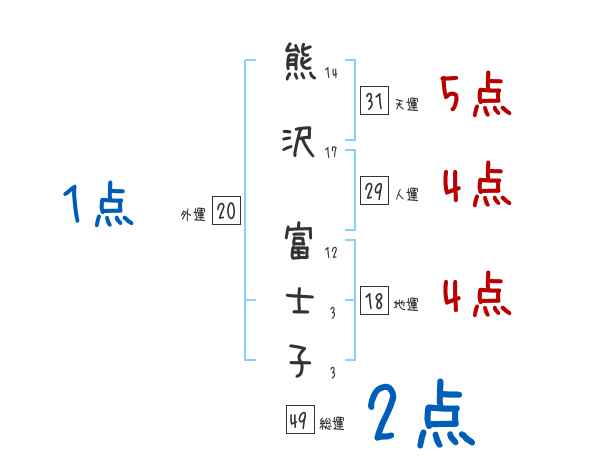 天運![]() | 熊沢富士子さんの天運は31画の5つ星!社交性があり判断力に優れる。順風満帆な人生で円満な生活。 家系が持つ宿命的な運勢を表します。祖先から受け継いだ苗字ですので自分の力が及びません。家柄を象徴します。 |