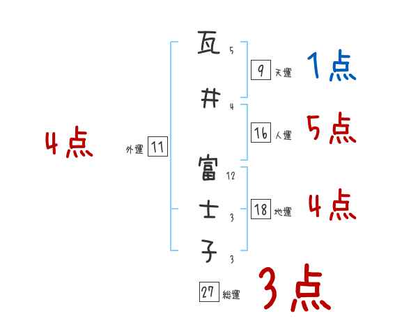 人運![]() | 瓦井富士子さんの人運は16画の5つ星!人望が厚く大きく発展する。逆転成功が見える。 性格や才能などを表す2番目に重要な運勢です。人間関係や協調性、社会的な成功に影響します。主に20歳から50歳ぐらいまでの中年期の運勢を表します。 |