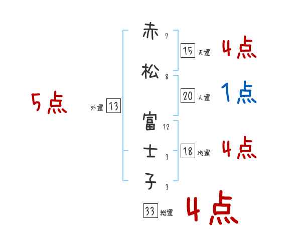 外運![]() | 赤松富士子さんの外運は13画の5つ星!才能に恵まれ人気がある。名声を手に入れる。円満な人生。 生活面を象徴する運勢です。外部から受ける影響力を表し、結婚運、家庭運や職場、環境への順応性を表します。 |