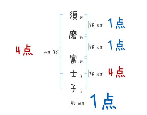 総運![]() | 須磨富士子さんの総運は46画の1つ星!迷走することが多く苦労するかも。目先のことにとらわれないように。 あなたの人生を表す1番重要な運勢です。生涯を通じて影響する総合運となり、主に50歳以降の晩年期に影響を及ぼします。 |
