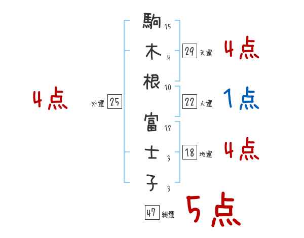 天運![]() | 駒木根富士子さんの天運は29画の4つ星!完全主義で才能がある。厳格な心の持ち主。 家系が持つ宿命的な運勢を表します。祖先から受け継いだ苗字ですので自分の力が及びません。家柄を象徴します。 |