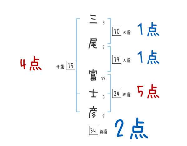 天運![]() | 三尾富士彦さんの天運は10画の1つ星!不安を感じやすい傾向。ストレスを抱えないように注意しましょう。 家系が持つ宿命的な運勢を表します。祖先から受け継いだ苗字ですので自分の力が及びません。家柄を象徴します。 |