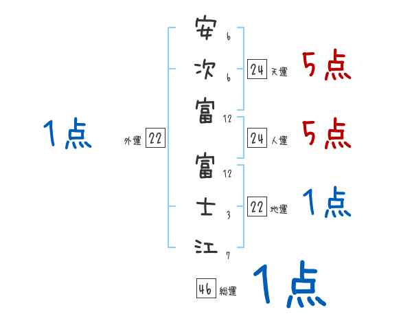 天運![]() | 安次富富士江さんの天運は24画の5つ星!家庭運が良く順調な人生。金運にも恵まれる。 家系が持つ宿命的な運勢を表します。祖先から受け継いだ苗字ですので自分の力が及びません。家柄を象徴します。 |