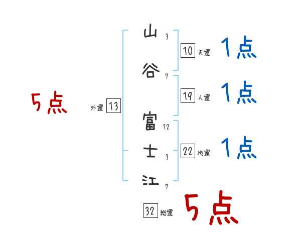 総運![]() | 山谷富士江さんの総運は32画の5つ星!柔軟性があり成功する。チャンスが多く金運が良い。 あなたの人生を表す1番重要な運勢です。生涯を通じて影響する総合運となり、主に50歳以降の晩年期に影響を及ぼします。 |
