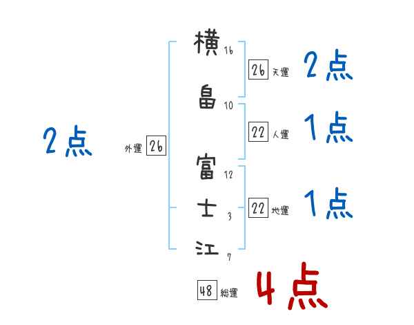 人運![]() | 横畠富士江さんの人運は22画の1つ星!努力することが苦手ないっぽう手先が器用。芸術性にも優れる。 性格や才能などを表す2番目に重要な運勢です。人間関係や協調性、社会的な成功に影響します。主に20歳から50歳ぐらいまでの中年期の運勢を表します。 |