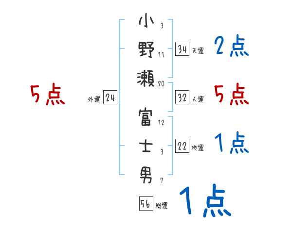 人運![]() | 小野瀬富士男さんの人運は32画の5つ星!柔軟性があり成功する。チャンスが多く金運が良い。 性格や才能などを表す2番目に重要な運勢です。人間関係や協調性、社会的な成功に影響します。主に20歳から50歳ぐらいまでの中年期の運勢を表します。 |