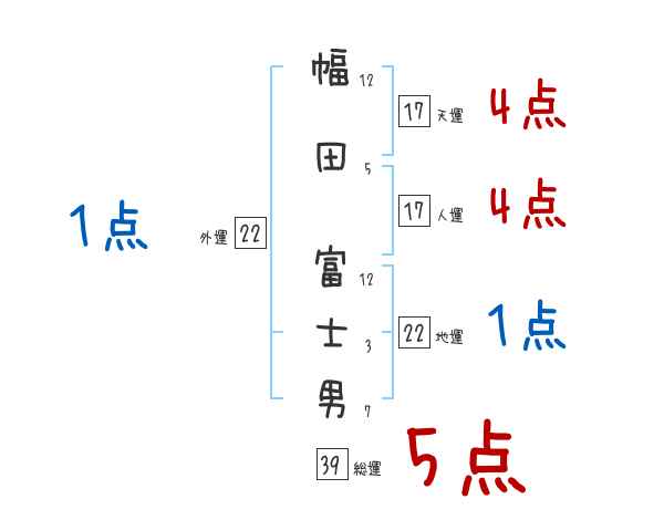 外運![]() | 幅田富士男さんの外運は22画の1つ星!努力することが苦手ないっぽう手先が器用。芸術性にも優れる。 生活面を象徴する運勢です。外部から受ける影響力を表し、結婚運、家庭運や職場、環境への順応性を表します。 |
