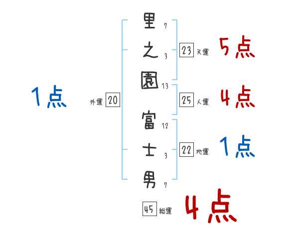 天運![]() | 里之園富士男さんの天運は23画の5つ星!想像力に優れ活力がある。一代で成功し名誉を手に入れる。 家系が持つ宿命的な運勢を表します。祖先から受け継いだ苗字ですので自分の力が及びません。家柄を象徴します。 |