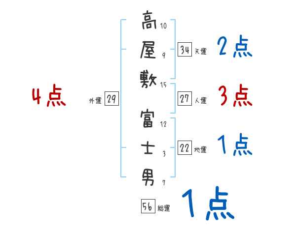 総運![]() | 高屋敷富士男さんの総運は56画の1つ星!消極的で無気力になりがち。誠実な気持ちが必要でしょう。 あなたの人生を表す1番重要な運勢です。生涯を通じて影響する総合運となり、主に50歳以降の晩年期に影響を及ぼします。 |