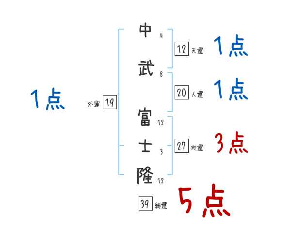 天運![]() | 中武富士隆さんの天運は12画の1つ星!簡単な失敗で諦めてしまいやすいかも。着実に行動すると良いでしょう。 家系が持つ宿命的な運勢を表します。祖先から受け継いだ苗字ですので自分の力が及びません。家柄を象徴します。 |