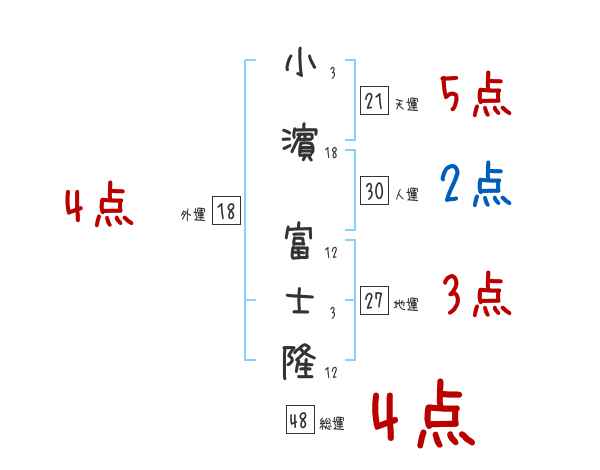 天運![]() | 小濵富士隆さんの天運は21画の5つ星!統率力がある。独立し成功する。名誉を手に入れる。 家系が持つ宿命的な運勢を表します。祖先から受け継いだ苗字ですので自分の力が及びません。家柄を象徴します。 |