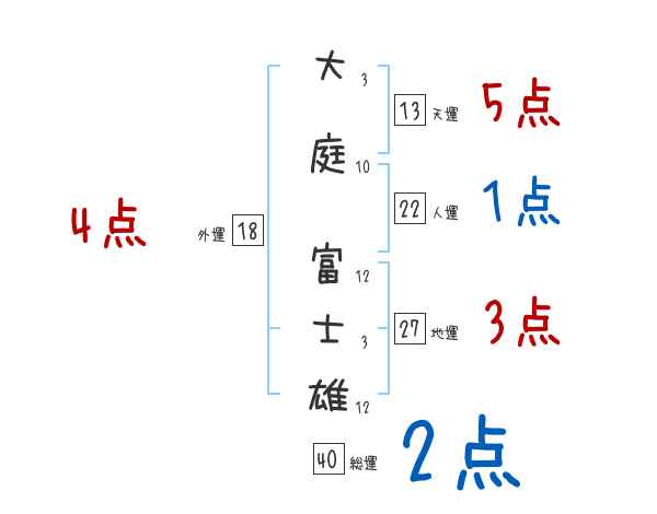 外運![]() | 大庭富士雄さんの外運は18画の4つ星!情熱的で剛気。忍耐力があり信頼される。 生活面を象徴する運勢です。外部から受ける影響力を表し、結婚運、家庭運や職場、環境への順応性を表します。 |