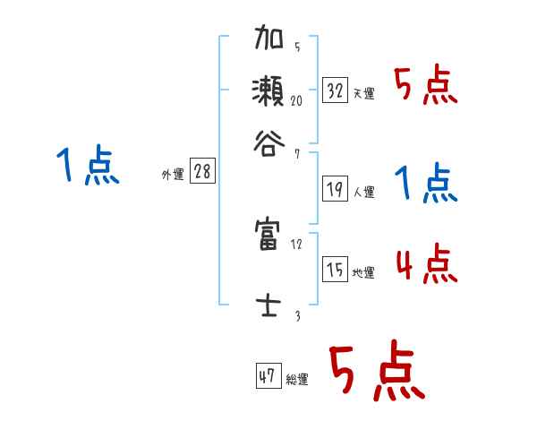 天運![]() | 加瀬谷富士さんの天運は32画の5つ星!柔軟性があり成功する。チャンスが多く金運が良い。 家系が持つ宿命的な運勢を表します。祖先から受け継いだ苗字ですので自分の力が及びません。家柄を象徴します。 |