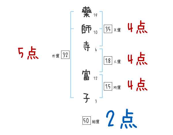 外運![]() | 藥師寺富子さんの外運は32画の5つ星!柔軟性があり成功する。チャンスが多く金運が良い。 生活面を象徴する運勢です。外部から受ける影響力を表し、結婚運、家庭運や職場、環境への順応性を表します。 |