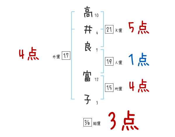 総運![]() | 高井良富子さんの総運は36画の3つ星!先見性が豊かです。多少神経質で苦労することも。 あなたの人生を表す1番重要な運勢です。生涯を通じて影響する総合運となり、主に50歳以降の晩年期に影響を及ぼします。 |