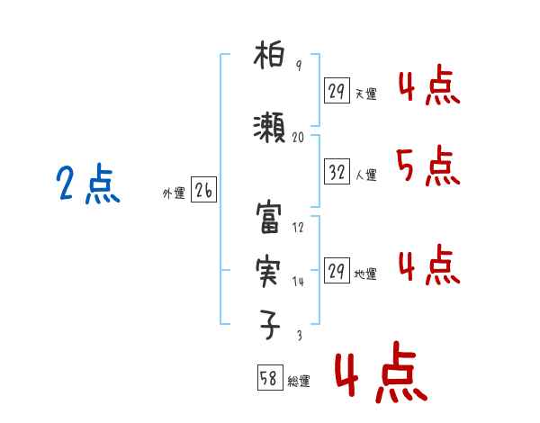 人運![]() | 柏瀬富実子さんの人運は32画の5つ星!柔軟性があり成功する。チャンスが多く金運が良い。 性格や才能などを表す2番目に重要な運勢です。人間関係や協調性、社会的な成功に影響します。主に20歳から50歳ぐらいまでの中年期の運勢を表します。 |