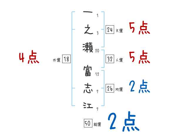 人運![]() | 一之瀬富志江さんの人運は32画の5つ星!柔軟性があり成功する。チャンスが多く金運が良い。 性格や才能などを表す2番目に重要な運勢です。人間関係や協調性、社会的な成功に影響します。主に20歳から50歳ぐらいまでの中年期の運勢を表します。 |