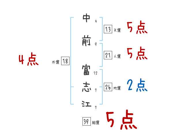 人運![]() | 中前富志江さんの人運は21画の5つ星!統率力がある。独立し成功する。名誉を手に入れる。 性格や才能などを表す2番目に重要な運勢です。人間関係や協調性、社会的な成功に影響します。主に20歳から50歳ぐらいまでの中年期の運勢を表します。 |