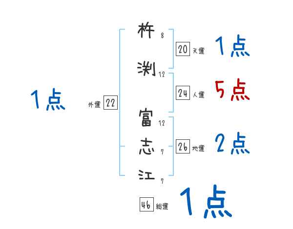 人運![]() | 杵渕富志江さんの人運は24画の5つ星!家庭運が良く順調な人生。金運にも恵まれる。 性格や才能などを表す2番目に重要な運勢です。人間関係や協調性、社会的な成功に影響します。主に20歳から50歳ぐらいまでの中年期の運勢を表します。 |