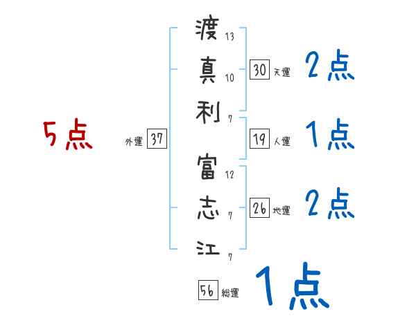 外運![]() | 渡真利富志江さんの外運は37画の5つ星!努力家で順応性に優れる。現実的な考え方ができ忠実に物事をこなす。 生活面を象徴する運勢です。外部から受ける影響力を表し、結婚運、家庭運や職場、環境への順応性を表します。 |