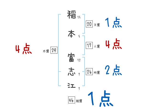 | 外運  | 稲本富志江さんの外運は29画の4つ星!完全主義で才能がある。厳格な心の持ち主。生活面を象徴する運勢です。外部から受ける影響力を表し、結婚運、家庭運や職場、環境への順応性を表します。 |