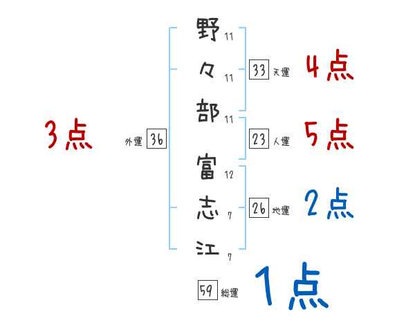 天運![]() | 野々部富志江さんの天運は33画の4つ星!権力志向でプライドが高い。勇気があり運を切り開き成功する。 家系が持つ宿命的な運勢を表します。祖先から受け継いだ苗字ですので自分の力が及びません。家柄を象徴します。 |