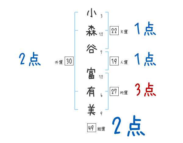 天運![]() | 小森谷富有美さんの天運は22画の1つ星!努力することが苦手ないっぽう手先が器用。芸術性にも優れる。 家系が持つ宿命的な運勢を表します。祖先から受け継いだ苗字ですので自分の力が及びません。家柄を象徴します。 |