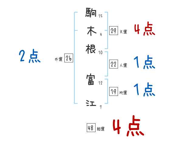 天運![]() | 駒木根富江さんの天運は29画の4つ星!完全主義で才能がある。厳格な心の持ち主。 家系が持つ宿命的な運勢を表します。祖先から受け継いだ苗字ですので自分の力が及びません。家柄を象徴します。 |