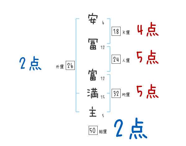 人運![]() | 安冨富満主さんの人運は24画の5つ星!家庭運が良く順調な人生。金運にも恵まれる。 性格や才能などを表す2番目に重要な運勢です。人間関係や協調性、社会的な成功に影響します。主に20歳から50歳ぐらいまでの中年期の運勢を表します。 |