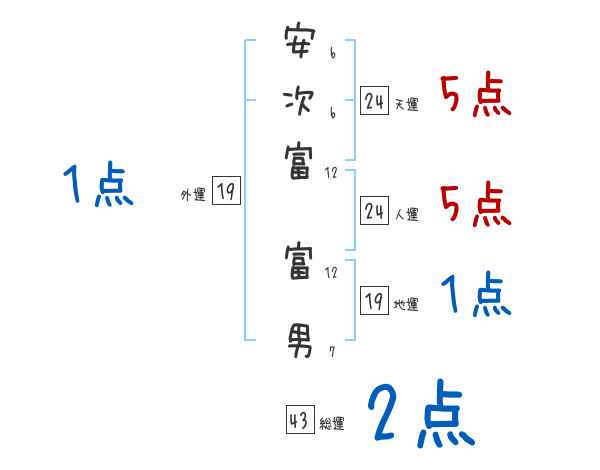 天運![]() | 安次富富男さんの天運は24画の5つ星!家庭運が良く順調な人生。金運にも恵まれる。 家系が持つ宿命的な運勢を表します。祖先から受け継いだ苗字ですので自分の力が及びません。家柄を象徴します。 |