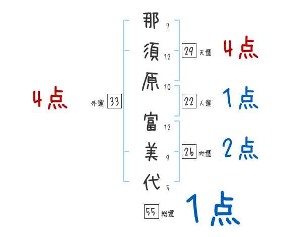 人運![]() | 那須原富美代さんの人運は22画の1つ星!努力することが苦手ないっぽう手先が器用。芸術性にも優れる。 性格や才能などを表す2番目に重要な運勢です。人間関係や協調性、社会的な成功に影響します。主に20歳から50歳ぐらいまでの中年期の運勢を表します。 |