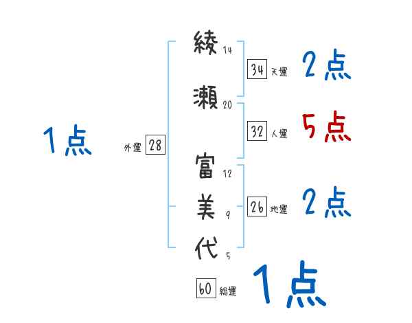 人運![]() | 綾瀬富美代さんの人運は32画の5つ星!柔軟性があり成功する。チャンスが多く金運が良い。 性格や才能などを表す2番目に重要な運勢です。人間関係や協調性、社会的な成功に影響します。主に20歳から50歳ぐらいまでの中年期の運勢を表します。 |