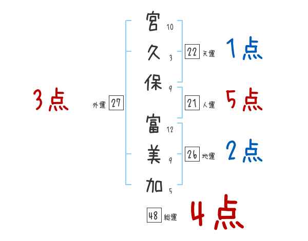 天運![]() | 宮久保富美加さんの天運は22画の1つ星!努力することが苦手ないっぽう手先が器用。芸術性にも優れる。 家系が持つ宿命的な運勢を表します。祖先から受け継いだ苗字ですので自分の力が及びません。家柄を象徴します。 |