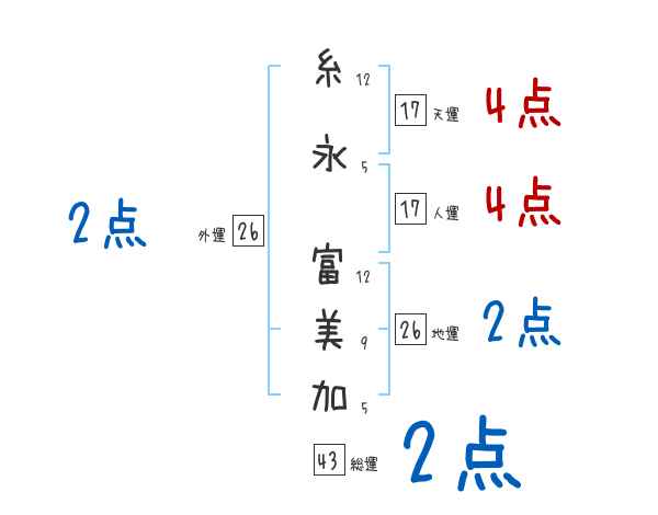 外運![]() | 糸永富美加さんの外運は26画の2つ星!波瀾万丈かも。信頼できる人を大事にしましょう。 生活面を象徴する運勢です。外部から受ける影響力を表し、結婚運、家庭運や職場、環境への順応性を表します。 |