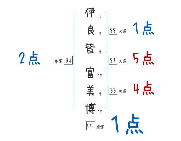 外運![]() | 伊良皆富美博さんの外運は34画の2つ星!独創性に優れるが、自尊心が強く災難に注意しましょう。 生活面を象徴する運勢です。外部から受ける影響力を表し、結婚運、家庭運や職場、環境への順応性を表します。 |