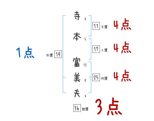 外運![]() | 寺本富美夫さんの外運は19画の1つ星!優れた才能を持ちますが、協調性が足りないことも。周りの人と協力する事を意識しましょう。 生活面を象徴する運勢です。外部から受ける影響力を表し、結婚運、家庭運や職場、環境への順応性を表します。 |