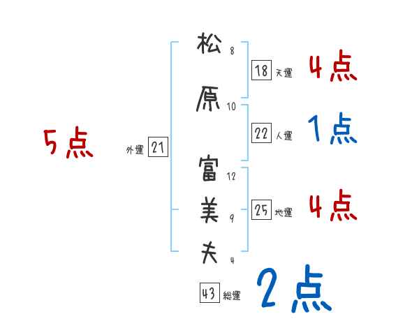 外運![]() | 松原富美夫さんの外運は21画の5つ星!統率力がある。独立し成功する。名誉を手に入れる。 生活面を象徴する運勢です。外部から受ける影響力を表し、結婚運、家庭運や職場、環境への順応性を表します。 |