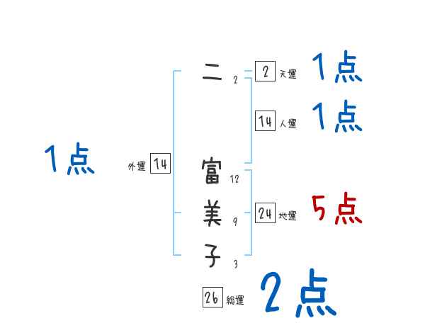 外運![]() | 二富美子さんの外運は14画の1つ星!人に対して優しいがストレスを溜め込みがち。人間関係のトラブルを避けるよう気をつけましょう。 生活面を象徴する運勢です。外部から受ける影響力を表し、結婚運、家庭運や職場、環境への順応性を表します。 |