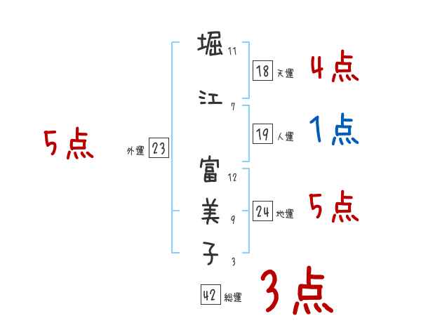 外運![]() | 堀江富美子さんの外運は23画の5つ星!想像力に優れ活力がある。一代で成功し名誉を手に入れる。 生活面を象徴する運勢です。外部から受ける影響力を表し、結婚運、家庭運や職場、環境への順応性を表します。 |