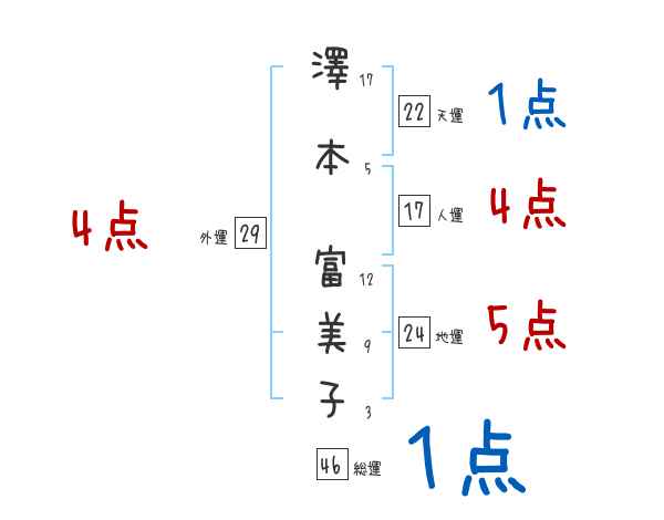 外運![]() | 澤本富美子さんの外運は29画の4つ星!完全主義で才能がある。厳格な心の持ち主。 生活面を象徴する運勢です。外部から受ける影響力を表し、結婚運、家庭運や職場、環境への順応性を表します。 |