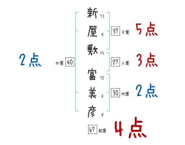 天運![]() | 新屋敷富美彦さんの天運は37画の5つ星!努力家で順応性に優れる。現実的な考え方ができ忠実に物事をこなす。 家系が持つ宿命的な運勢を表します。祖先から受け継いだ苗字ですので自分の力が及びません。家柄を象徴します。 |