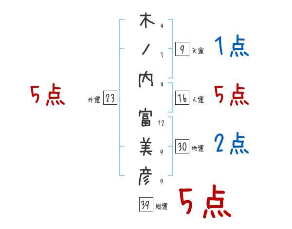外運![]() | 木ノ内富美彦さんの外運は23画の5つ星!想像力に優れ活力がある。一代で成功し名誉を手に入れる。 生活面を象徴する運勢です。外部から受ける影響力を表し、結婚運、家庭運や職場、環境への順応性を表します。 |