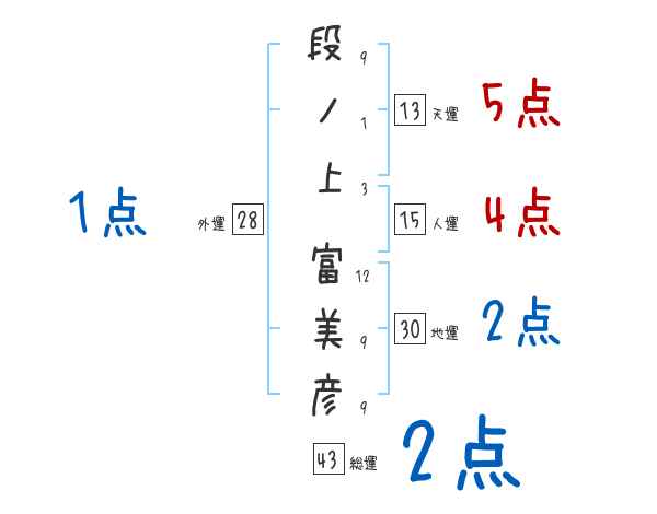 天運![]() | 段ノ上富美彦さんの天運は13画の5つ星!才能に恵まれ人気がある。名声を手に入れる。円満な人生。 家系が持つ宿命的な運勢を表します。祖先から受け継いだ苗字ですので自分の力が及びません。家柄を象徴します。 |