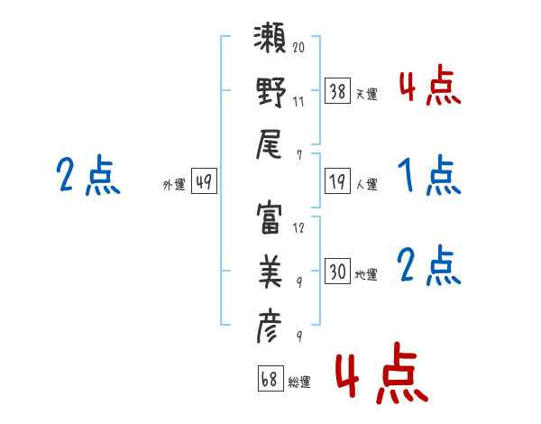 総運![]() | 瀬野尾富美彦さんの総運は68画の4つ星!潜在能力が高く集中力が高い。勤勉に励み発展する。 あなたの人生を表す1番重要な運勢です。生涯を通じて影響する総合運となり、主に50歳以降の晩年期に影響を及ぼします。 |