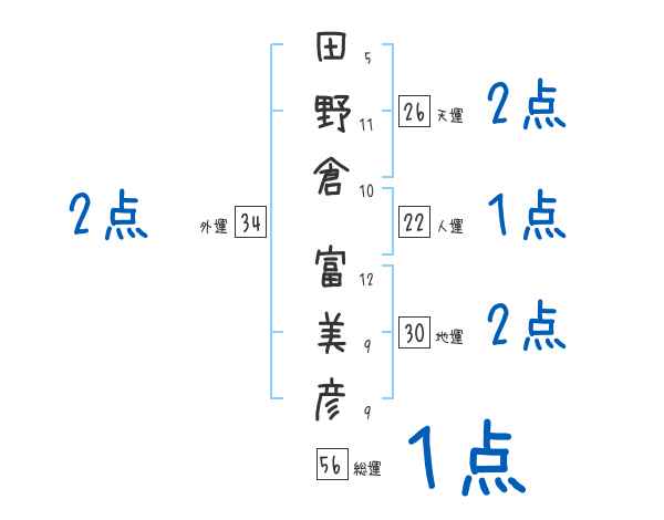人運![]() | 田野倉富美彦さんの人運は22画の1つ星!努力することが苦手ないっぽう手先が器用。芸術性にも優れる。 性格や才能などを表す2番目に重要な運勢です。人間関係や協調性、社会的な成功に影響します。主に20歳から50歳ぐらいまでの中年期の運勢を表します。 |