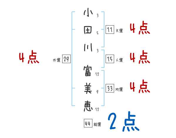 総運![]() | 小田川富美恵さんの総運は44画の2つ星!誠実で慎重な性格。物事を考えすぎないように注意しましょう。 あなたの人生を表す1番重要な運勢です。生涯を通じて影響する総合運となり、主に50歳以降の晩年期に影響を及ぼします。 |
