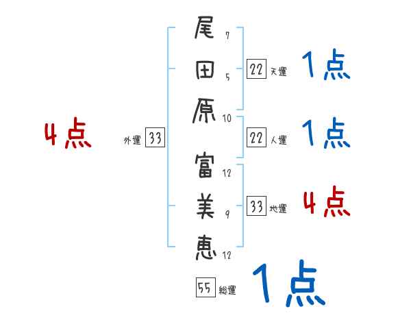 人運![]() | 尾田原富美恵さんの人運は22画の1つ星!努力することが苦手ないっぽう手先が器用。芸術性にも優れる。 性格や才能などを表す2番目に重要な運勢です。人間関係や協調性、社会的な成功に影響します。主に20歳から50歳ぐらいまでの中年期の運勢を表します。 |