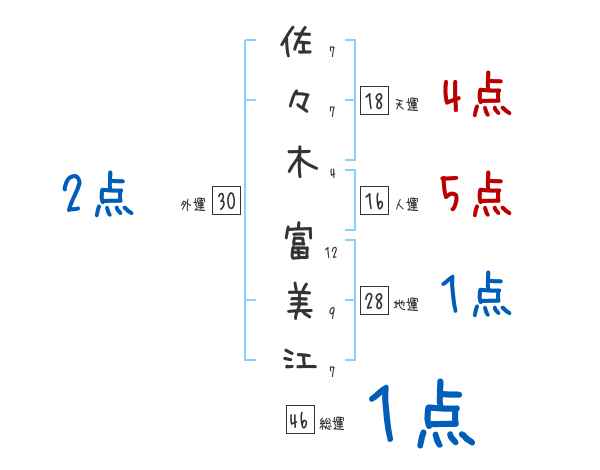 天運![]() | 佐々木富美江さんの天運は18画の4つ星!情熱的で剛気。忍耐力があり信頼される。 家系が持つ宿命的な運勢を表します。祖先から受け継いだ苗字ですので自分の力が及びません。家柄を象徴します。 |