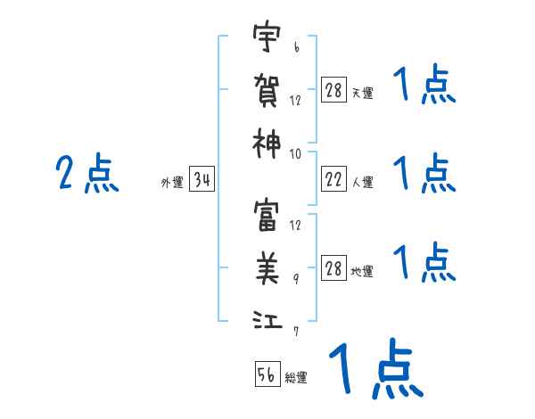 人運![]() | 宇賀神富美江さんの人運は22画の1つ星!努力することが苦手ないっぽう手先が器用。芸術性にも優れる。 性格や才能などを表す2番目に重要な運勢です。人間関係や協調性、社会的な成功に影響します。主に20歳から50歳ぐらいまでの中年期の運勢を表します。 |
